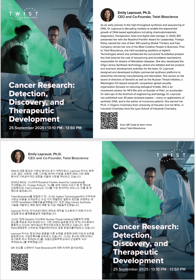 강연 주제는 **“From DNA to AI: 차세대 바이오테크놀로지에서 유전자 합성의 역할”**로, 트위스트바이오의 실리콘 기반 DNA 합성 플랫폼이 헬스케어, 농업, 산업 생명공학 등 다양한 분야의 연구를 어떻게 혁신하고 있는지를 소개합니다.